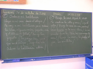 Se ha seguido realizando la actividad que comenzamos el lunes y que no se concluyó. La actividad en cuestión consistía en crear frases sueltas, separadas por "/", que tuvieran una secuencia lógica y en consonancia con el tiempo, de aquellas actividades que realizamos cotidianamente en nuestras vidas. El objetivo era crear estas pequeñas historias para poder jugar después al "Gato copión".